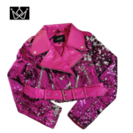 Esta chaqueta se distingue por su tejido de lentejuelas brillantes, un cuello de solapa en contraste (generalmente de un color liso como el fucsia en la imagen), mangas largas y un diseño de frente abierto. A menudo incorpora una correa con hebilla en la cintura para un ajuste ceñido y un estilo de chaqueta de motorista recortada.